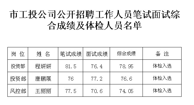 市工投公司現將公開招聘工作人員考試綜合成績(筆試成績50%+面試成績50%)和進入體檢環節人員名單公示如下,具體體檢事項另行通知。